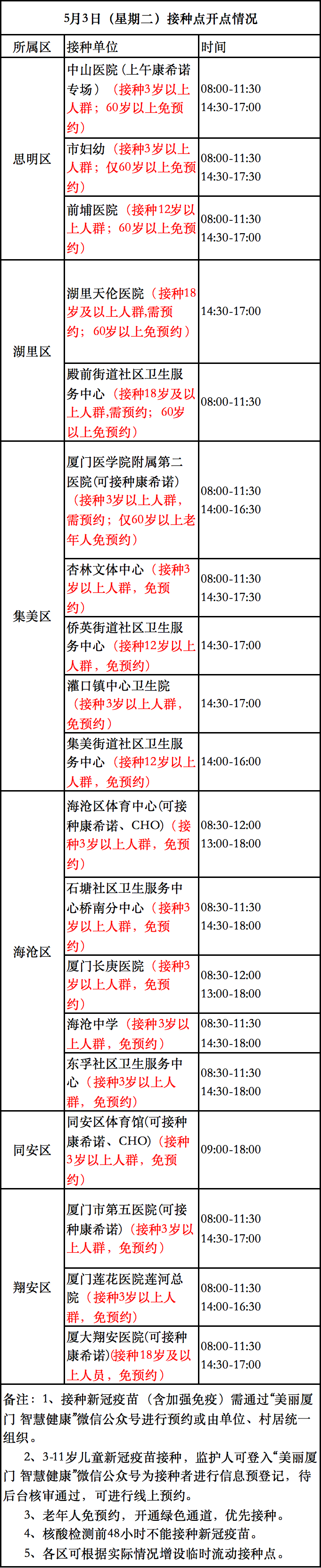 5月3日厦门新冠疫苗接种点公布