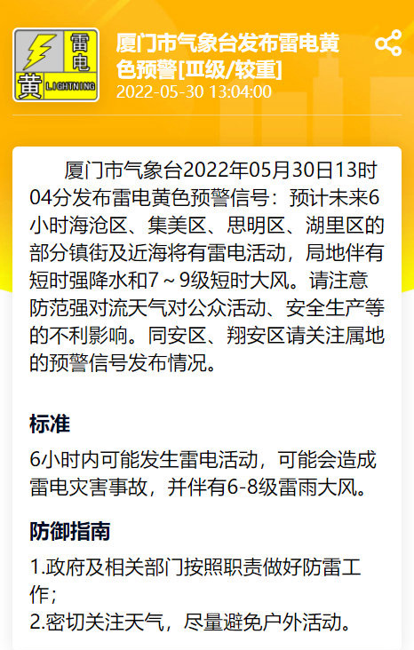 厦门网讯 厦门市气象台2022年05月30日13时04分发布雷电黄色预警信号:预计未来6小时海沧区、集美区、思明区、湖里区的部分镇街及近海将有雷电活动,局地伴有短时强降水和7~9级短时大风。请注意防范强对流天气对公众活动、安全生产等的不利影响。同安区、翔安区请关注属地的预警信号发布情况。