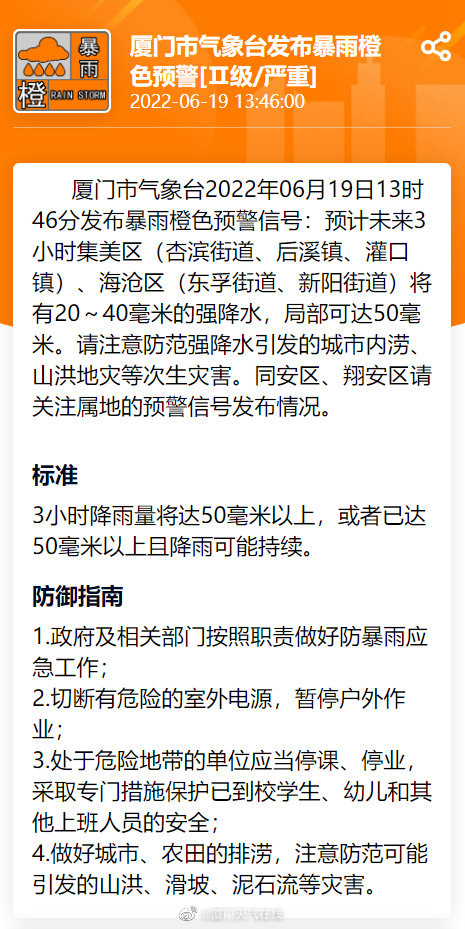 厦门网讯 厦门市气象台2022年06月19日13时46分发布暴雨橙色预警信号:预计未来3小时集美区(杏滨街道、后溪镇、灌口镇)、海沧区(东孚街道、新阳街道)将有20~40毫米的强降水,局部可达50毫米。请注意防范强降水引发的城市内涝、山洪地灾等次生灾害。同安区、翔安区请关注属地的预警信号发布情况。