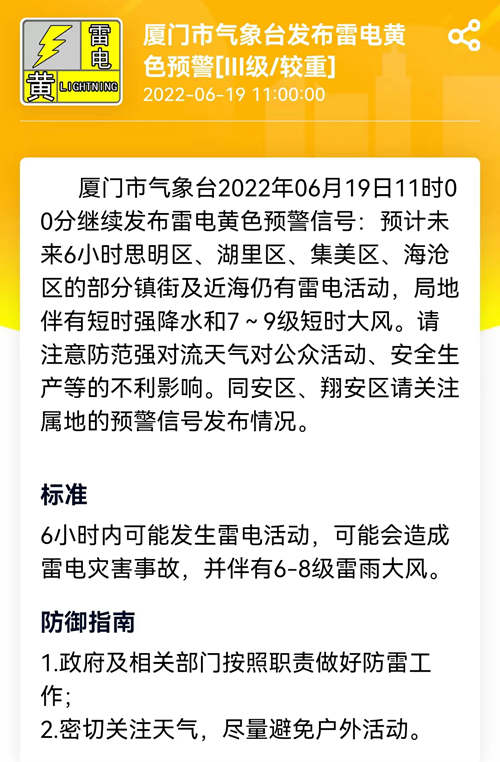 厦门网讯 厦门市气象台2022年06月19日11时00分继续发布雷电黄色预警信号:预计未来6小时思明区、湖里区、集美区、海沧区的部分镇街及近海仍有雷电活动,局地伴有短时强降水和7~9级短时大风。请注意防范强对流天气对公众活动、安全生产等的不利影响。同安区、翔安区请关注属地的预警信号发布情况。