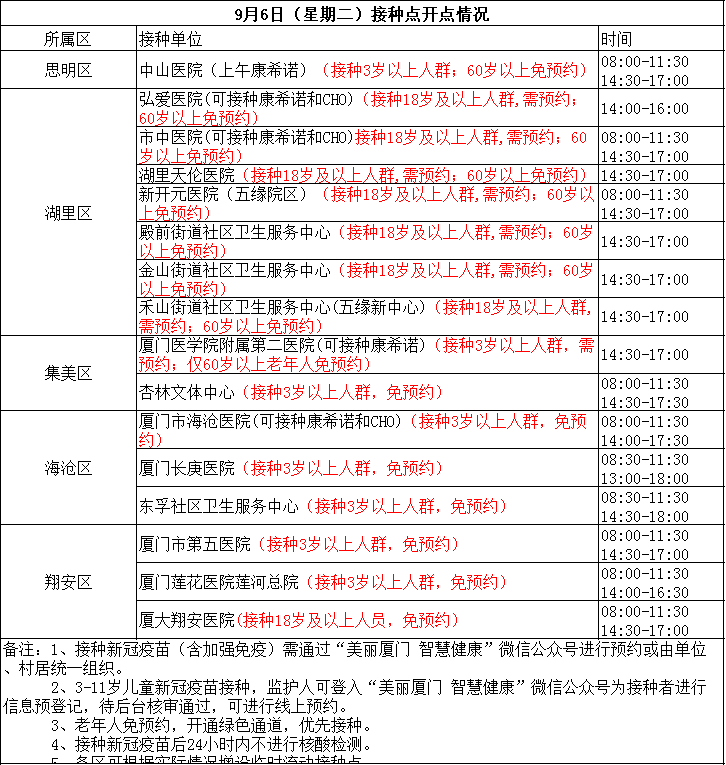 厦门网讯(厦门日报记者 陈莼)9月6日,厦门有16个疫苗接种点提供新冠疫苗接种服务。接种新冠疫苗(含加强免疫)需通过“美丽厦门智慧健康”微信公众号进行预约或由单位、村居统一组织。3-11岁儿童新冠疫苗接种,监护人可登录“美丽厦门智慧健康”微信公众号为接种者进行信息预登记,待后台审核通过,可进行线上预约。老年人免预约,开通绿色通道,优先接种。