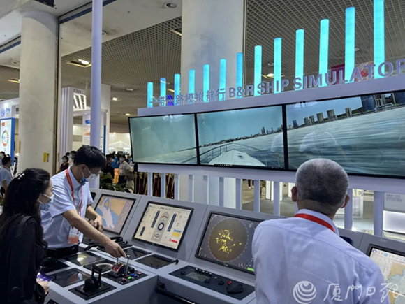 在“丝路海运”主题展馆有一台模拟航行系统,完全模拟行船实际状况,现场有“船长”带您直观体验航行全过程。“船长”说,行船不仅仅是前进、后退、转向那么简单,还必须综合考虑航路上的水文天气信息、各类船舶状况等,这些都能从这套模拟航行系统的“驾驶台”获知。