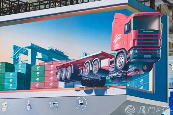 裸眼3D大屏出现在C馆的丝路海运馆,穿梭在码头内的集装箱卡车完成卸货并“破屏而出”,逼真绚丽的3D立体画面震撼登场。