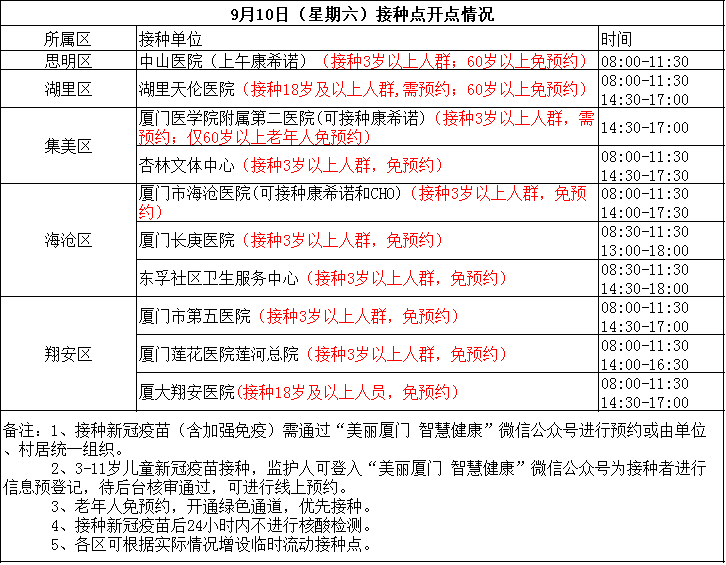 厦门网讯(厦门日报记者 陈莼)9月10日,厦门有10个疫苗接种点提供新冠疫苗接种服务。接种新冠疫苗(含加强免疫)需通过“美丽厦门智慧健康”微信公众号进行预约或由单位、村居统一组织。3-11岁儿童新冠疫苗接种,监护人可登录“美丽厦门智慧健康”微信公众号为接种者进行信息预登记,待后台审核通过,可进行线上预约。老年人免预约,开通绿色通道,优先接种。