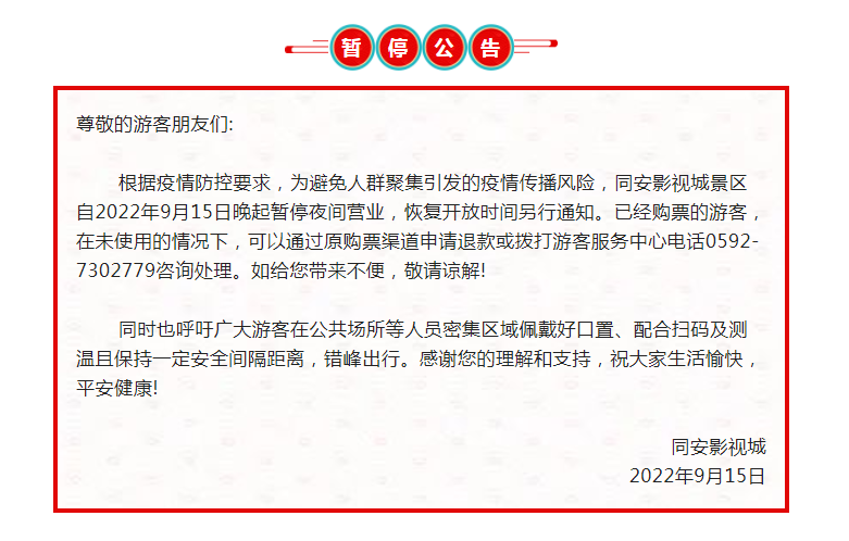 根据疫情防控要求,为避免人群聚集引发的疫情传播风险,同安影视城景区自2022年9月15日晚起暂停夜间营业,恢复开放时间另行通知。已经购票的游客,在未使用的情况下,可以通过原购票渠道申请退款或拨打游客服务中心电话0592-7302779咨询处理。