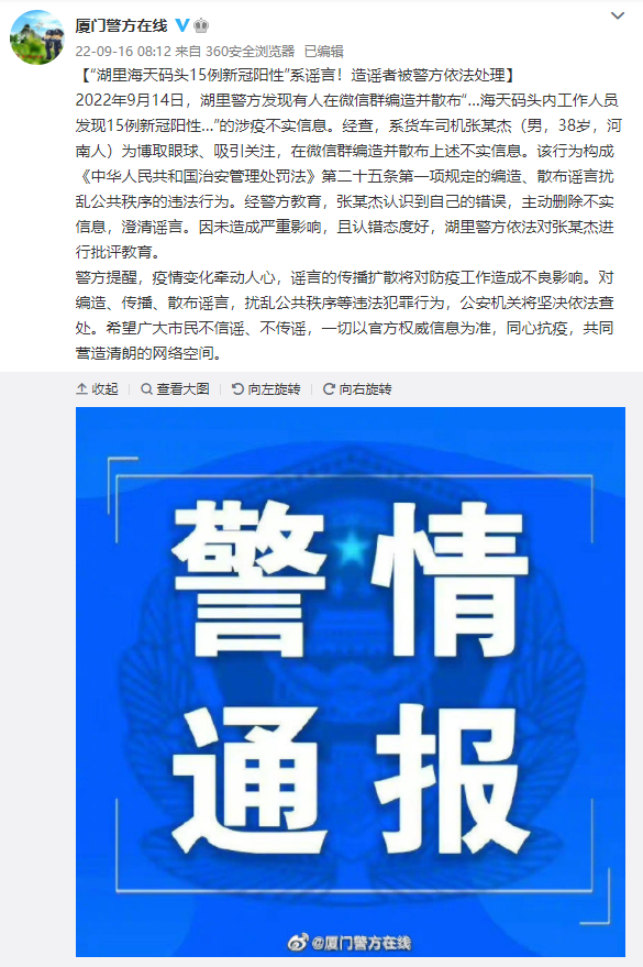 “湖里海天码头15例新冠阳性”系谣言!造谣者被警方依