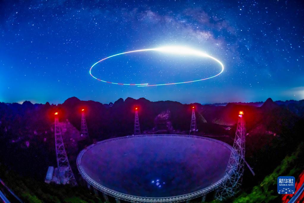 银河下的“中国天眼”全景(无人机光绘照片,2022年7月24日维护保养期间拍摄)。