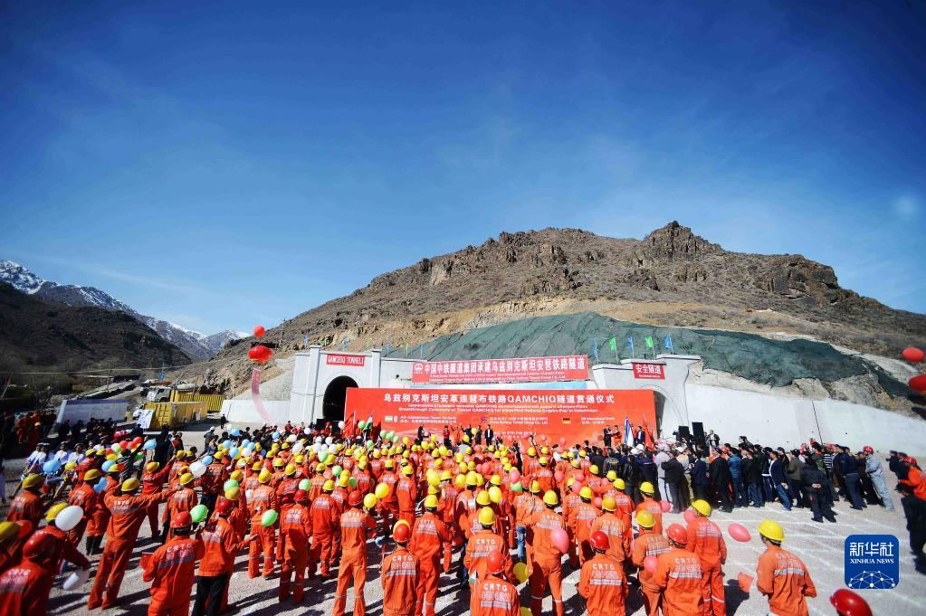 这是2016年2月27日在乌兹别克斯坦“安格连-帕普”铁路卡姆奇克隧道出口拍摄的全隧贯通仪式现场。 新华社记者 沙达提 摄