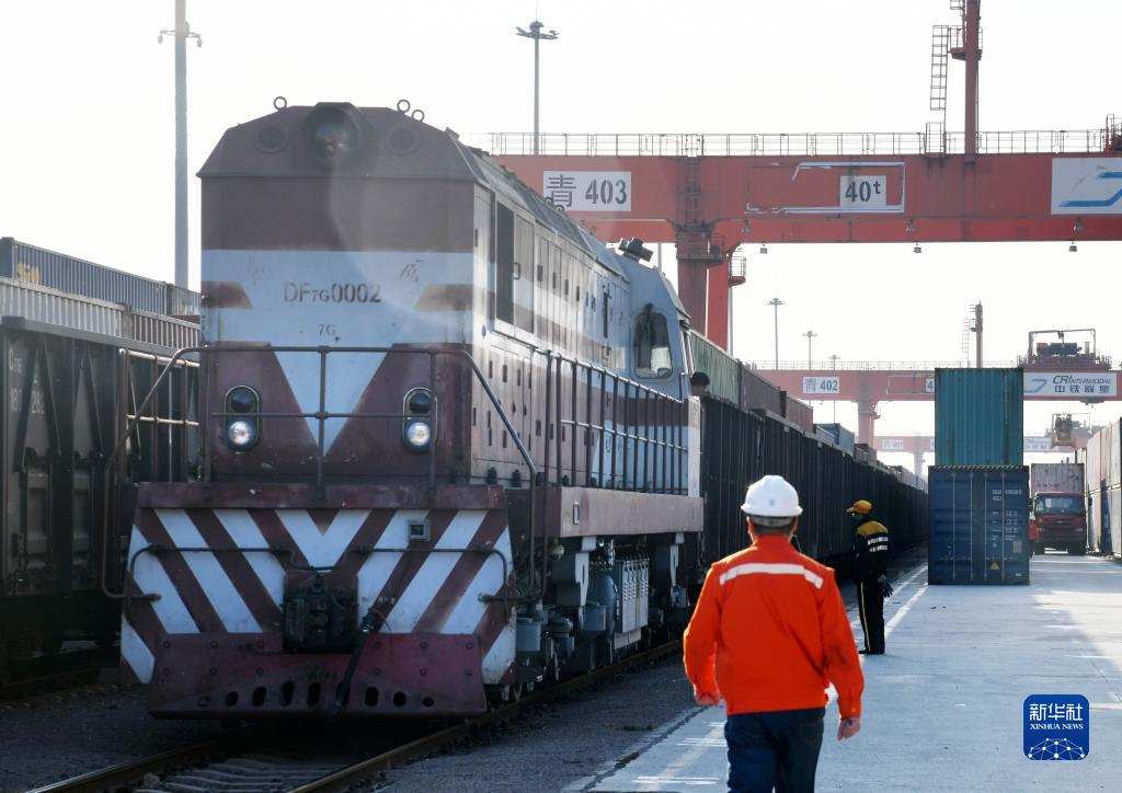 一列搭载轮胎、汽车配件、电子元件等货物的“齐鲁号”中亚班列即将发车驶出位于青岛的中国-上合组织地方经贸合作示范区青岛多式联运中心(2020年11月9日摄)。新华社记者 李紫恒 摄
