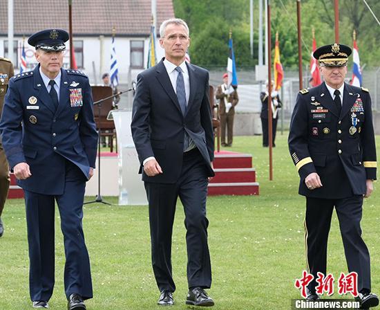 沃尔特斯(左一)、北约秘书长斯托尔滕贝格(中)在2019年5月的北约欧洲盟军最高司令交接仪式上亮相。北约供图