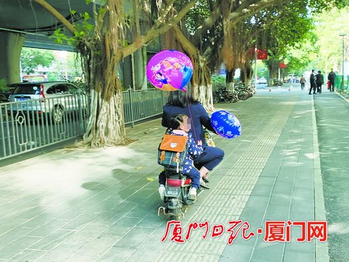 记者沿着该路口往嘉禾路方向行走发现,一名未佩戴安全头盔的家长骑着电动车,前后各载着一名儿童,儿童手中还各扯着一个气球,气球随风摆来摆去,一旦被低矮的树枝钩住,可能给儿童带来伤害。