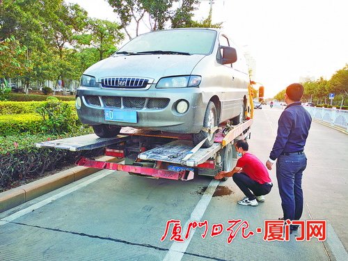厦门网讯 (文/图厦门日报记者 张玉榕) 昨日,厦门日报A04版报道了“僵尸车”问题后,当日上午11时许,新店交警中队组织民警到相关区域实地排查,在翔安区新店街道南洋学院路段找到停放在公共停车位的“僵尸车”。民警随即联系车主到场,现场告知车主由于其长期占用公共车位已经影响到车位日常使用功能,责令其马上整改。经过民警一番批评教育,车主认识到自己行为的不妥。昨日下午4时许,在民警的监督下,车主叫来拖车将车辆移走。