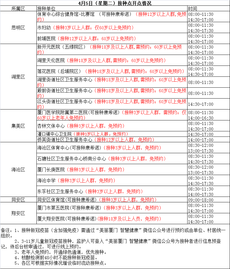 4月5日厦门新冠疫苗接种点公布
