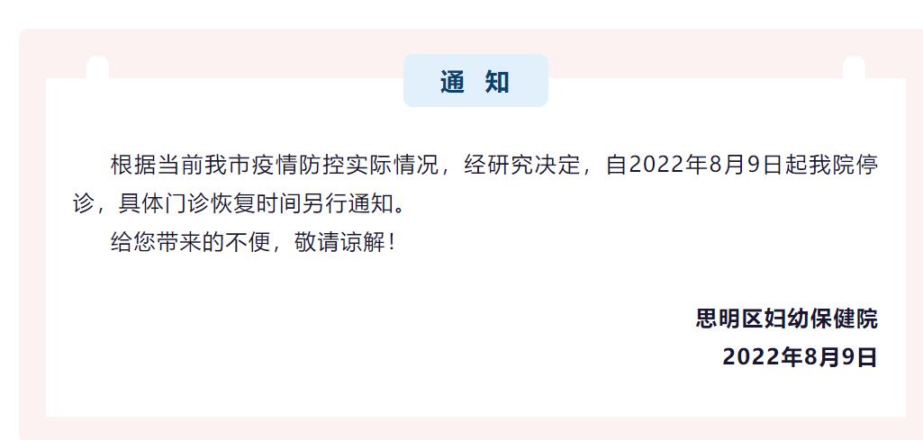 根据当前我市疫情防控实际情况,经研究决定,自2022年8月9日起我院停诊,具体门诊恢复时间另行通知。