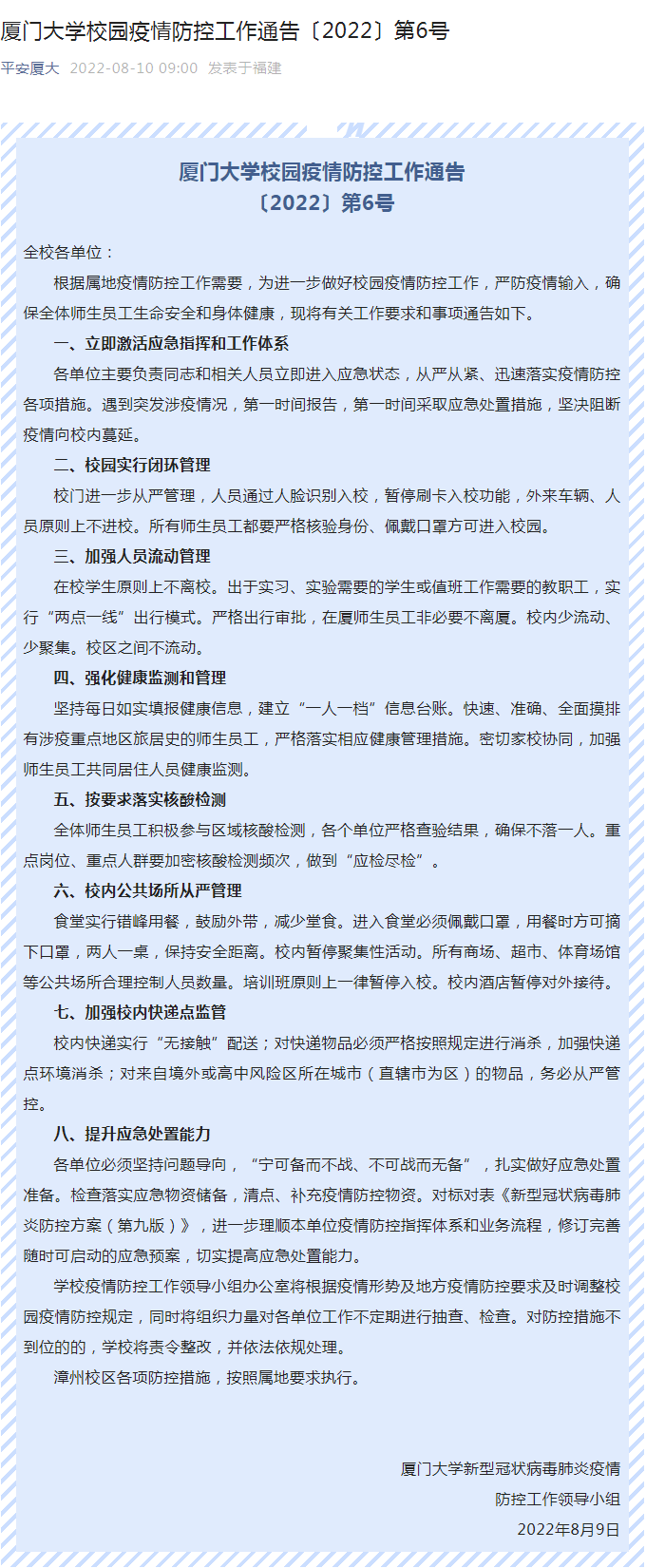 厦大发布第六号校园疫情防控工作通告,人脸识别入校,暂停刷卡入校功能,在厦师生非必要不离厦。