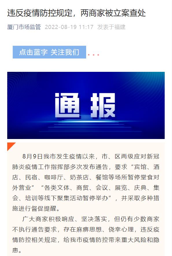 厦门网讯 据“厦门市场监管”微信公众号,8月9日我市发生疫情以来,市、区两级应对新冠肺炎疫情工作指挥部多次发布通告,要求“宾馆、酒店、民宿、咖啡厅、奶茶店、餐馆等场所暂停堂食对外营业”“各类文体、商贸、会议、展览、庆典、集会、培训等线下聚集活动暂停举办”,并采取多种措施进行督促提醒。