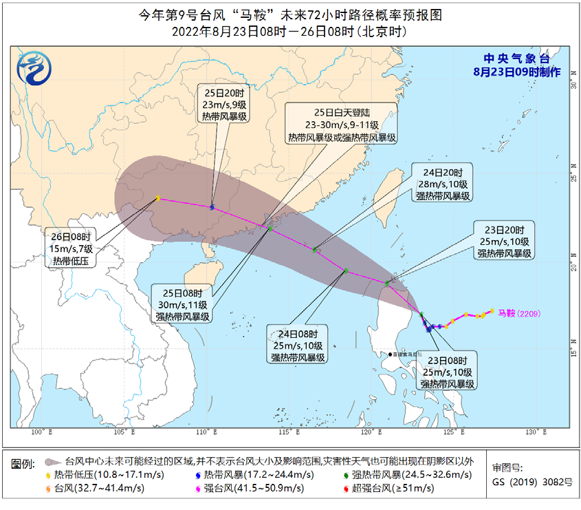 今年第9号台风“马鞍”(强热带风暴级)今天(23日)08时中心位于菲律宾马尼拉东北方向约345公里的洋面上(北纬17.0度,东经123.0度),中心附近最大风力10级(25米/秒),中心最低气压985百帕。