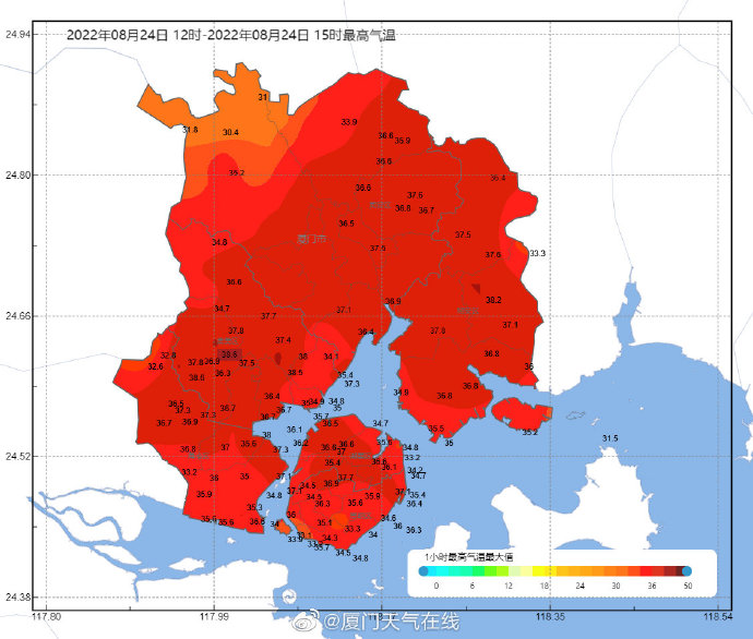 再来看一下今天午后的高温,全市最高温为38.6℃,出现在集美区李林村。厦门本站最高温34.5℃,并没有达到高温日。