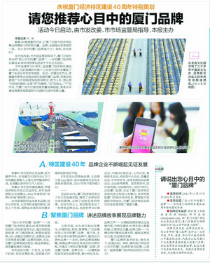 品牌记录历史,品牌见证时代。您心目中的“厦门品牌”是什么?市民、读者、单位可以通过推荐心中最具标志性、代表性以及对厦门产业发展有着推动意义的厦门品牌,讲述品牌背后的发展故事,表达对厦门这座城市的爱恋。本报记者将深度采访,为您展示品牌的风采。