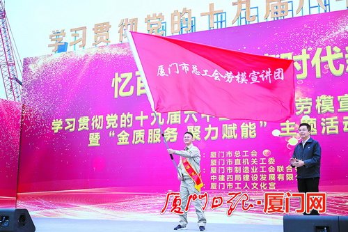 厦门网讯 (文/厦门日报记者 翁华鸿 通讯员 林依静 图/厦门日报记者 林铭鸿)11月8日至11日,中国共产党第十九届中央委员会第六次全体会议在北京举行。连日来,我市广大职工群众迅速掀起全会精神学习宣传贯彻热潮。11月17日,市总工会、市直机关工委主办的学习贯彻党的十九届六中全会精神劳模宣讲走进建设工地暨“金质服务聚力赋能”主题活动启动仪式,在厦门新会展中心项目建设工地举行。