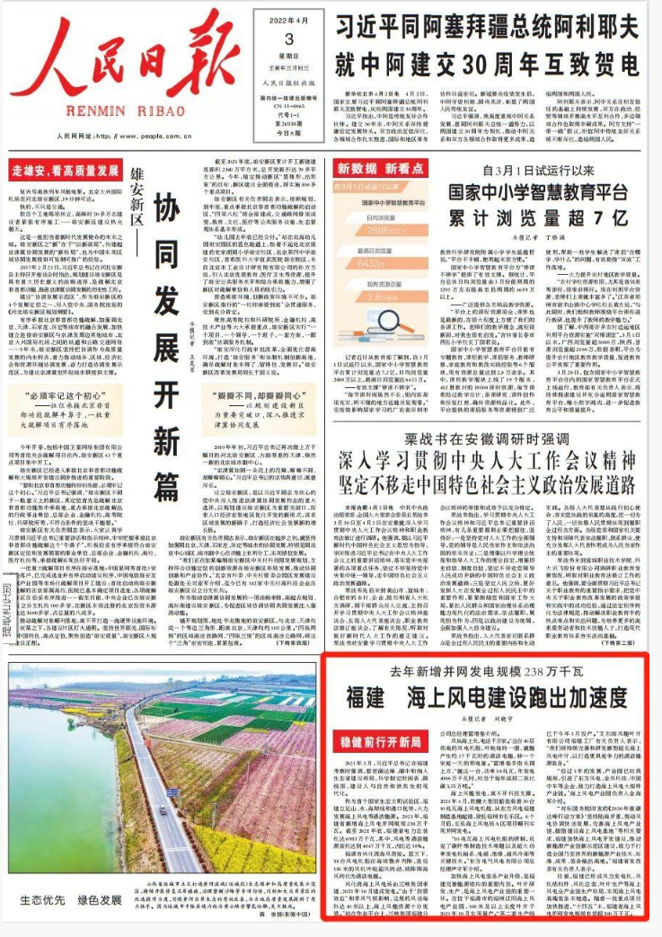 4月3日,《人民日报》头版“稳健前行开新局”专栏刊发通讯《福建海上风电建设跑出加速度》,点赞作为首个国家生态文明试验区的福建省,贯彻落实习近平总书记来闽考察重要指示精神,立足山、水、海岸线和港口优势,大力发展海上风电等清洁能源,把碳达峰、碳中和纳入生态省建设布局,科学制定时间表、路线图,建设人与自然和谐共生的现代化。