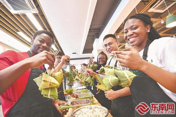 厦门网讯 据福建日报报道(记者 林辉 通讯员 林煜轩 摄影报道)3日,福州外语外贸学院开展“外国留学生过端午”活动。过端午,自然少不了包粽子、吃粽子。叠粽叶、填糯米、放蜜枣、系绳子,校食堂工作人员演示着包粽子的方法,并手把手教给留学生。留学生们还品尝到了工作人员提前准备好的粽子,在趣味活动中感受中国传统文化的魅力。