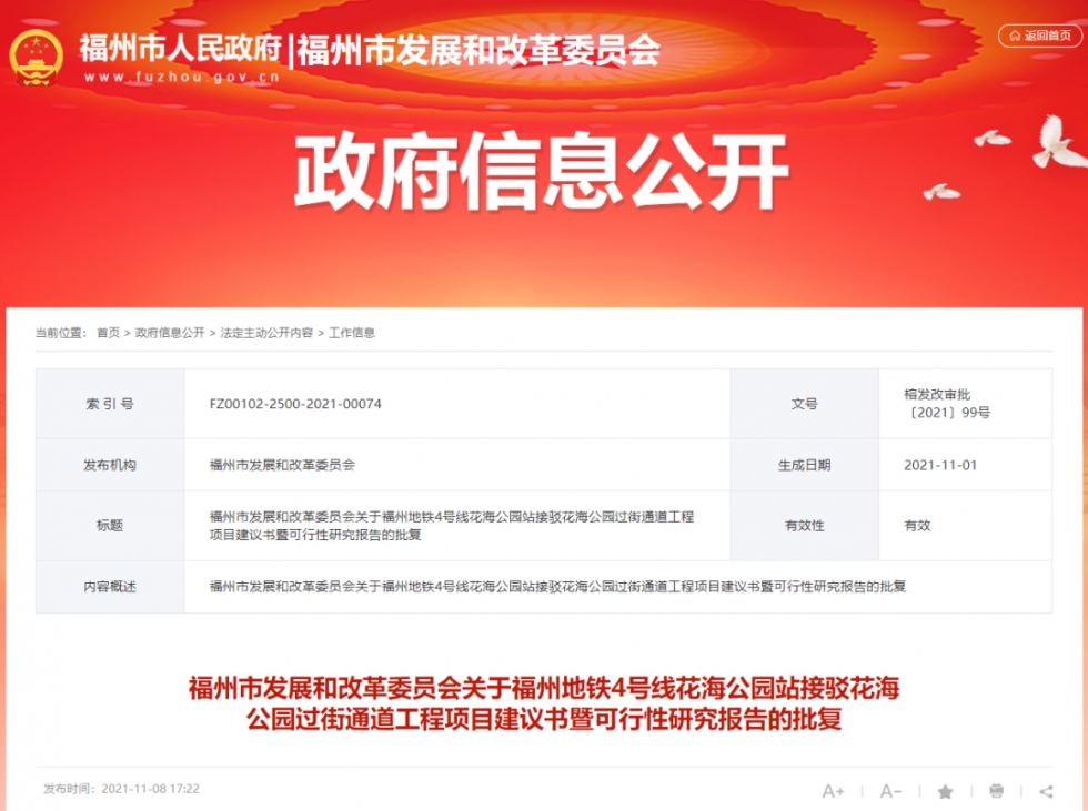 厦门网讯 据福州新闻网报道 昨日,福州市发改委发布批文,原则同意福州地铁4号线花海公园站接驳花海公园过街通道工程项目建议书暨可行性研究报告。这意味着,未来市民乘坐地铁出站后通过过街通道即可直达花海公园!