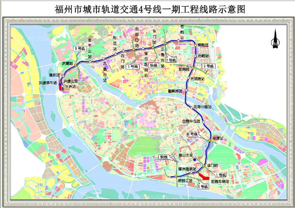 4号线(一期)工程长28.4公里,起于半洲站,终于帝封江站,共设23个站点,线路途经仓山、鼓楼、晋安、台江,是串联起福州中心城区的交通要道。