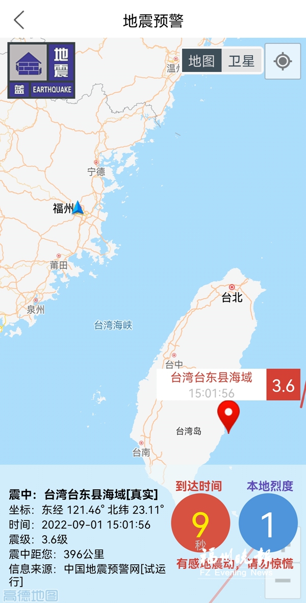 市民还可以下载“福建地震预警”APP,查询、接收预警信息。记者看到,该应用设置了预警回放、地震速报、地震科普、避难场所等功能。以最近一次发生在9月1日的台湾台东县海域地震为例,预警信息显示:震级为3.6级,震中距离鼓楼区约396公里,预警时间为9秒,本地烈度为1级,提示请勿惊慌。