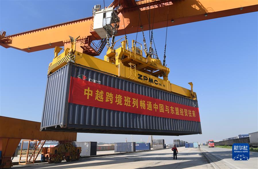在广西南宁国际铁路港,工人在吊装中越跨境班列货物集装箱(2020年11月11日摄)。新华社记者陆波岸摄