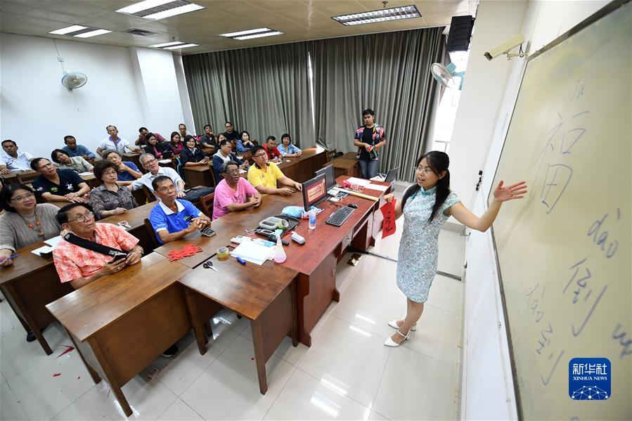 在广西大学,老师给泰国访华团成员讲解汉字“福”(2018年6月25日摄)。新华社记者陆波岸摄