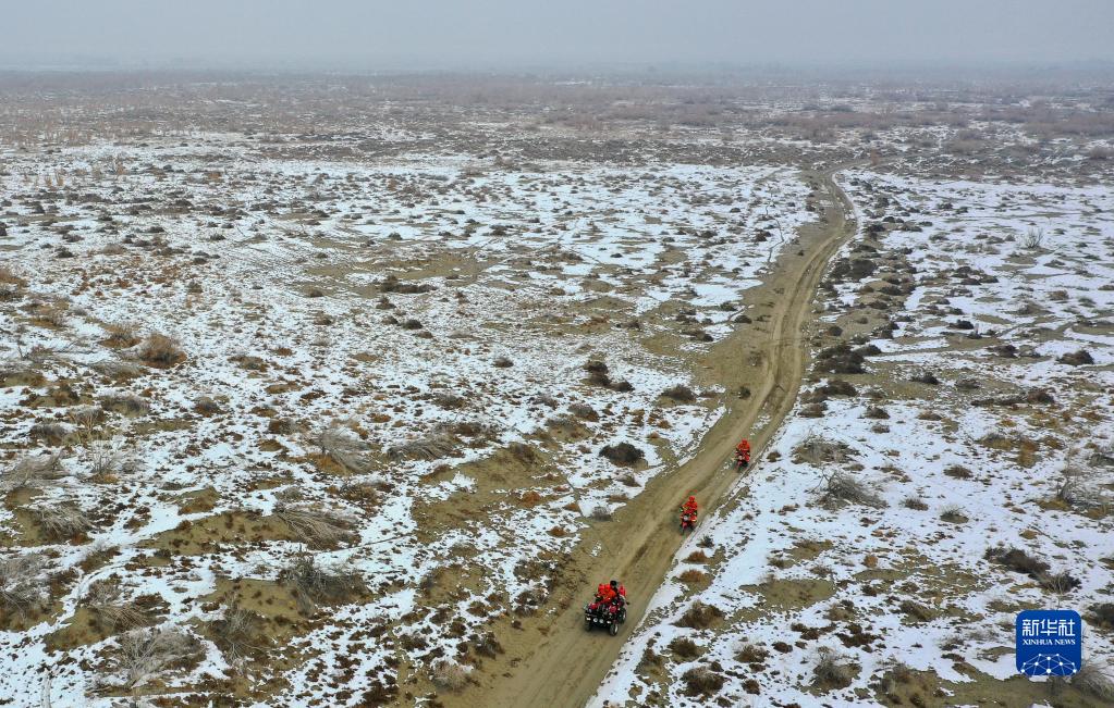 乌苏市甘家湖林场的管护人员在巡逻中(12月4日摄,无人机照片)。