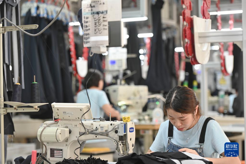 在位于福建省泉州市经济技术开发区的九牧王西裤智能化生产车间,工人在自动化西裤吊挂流水线上作业(7月30日摄)。新华社记者宋为伟摄