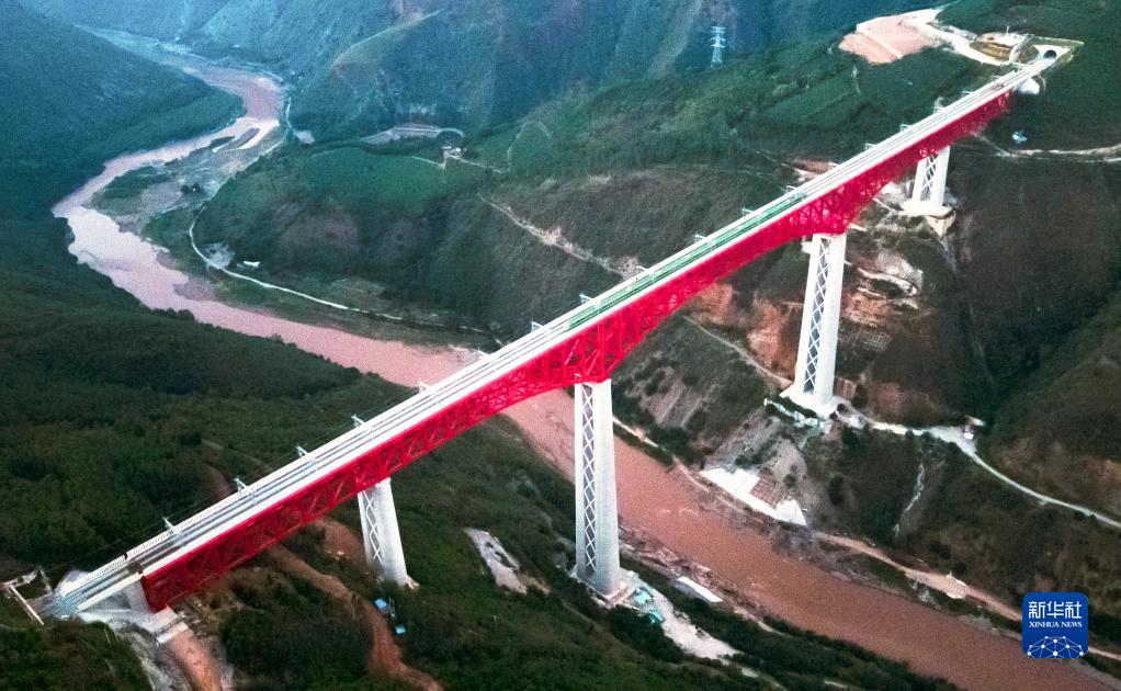 中老铁路首发列车驶过中国云南省元江哈尼族彝族傣族自治县境内的元江双线特大桥(12月3日摄,无人机照片)。新华社记者王冠森摄