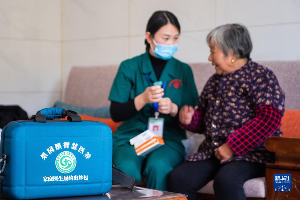 11月12日,在湖南省长沙市长沙县果园镇杨泗庙社区,医务人员刘敏指导居家老人用药。新华社记者陈思汗摄