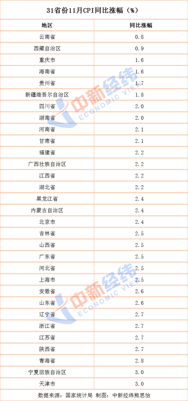 对比31省份数据,云南、西藏11月CPI同比涨幅低于1%,分别为0.8%、0.9%;海南、重庆、贵州、新疆、湖南、四川、河南、甘肃、福建、江西、湖北、广西12省份11月CPI同比涨幅高于1%,但低于全国水平;剩余17省份CPI同比涨幅均高于全国水平,其中天津、宁夏两省份涨幅最高达3%。