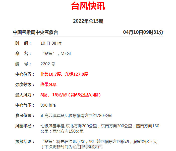 今年第02号台风“鲇鱼”(英文名:Super Typhoon Megi ,名称来源于韩国)于10日08时在菲律宾东部近海海面上生成。