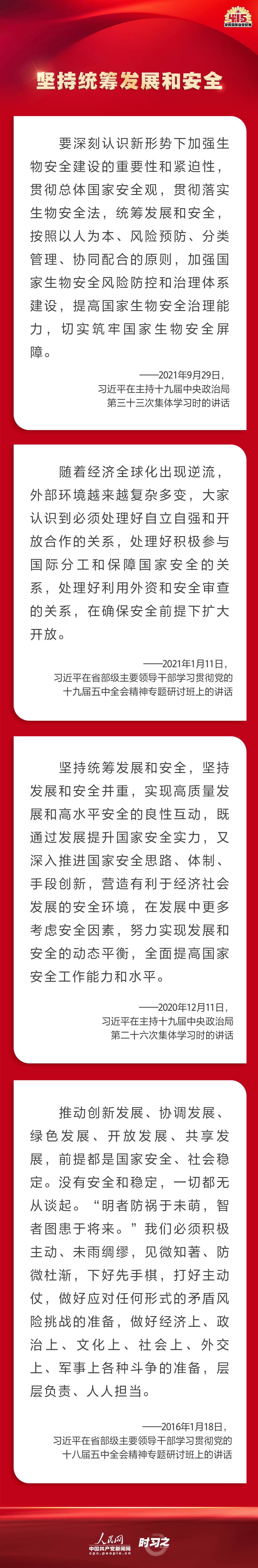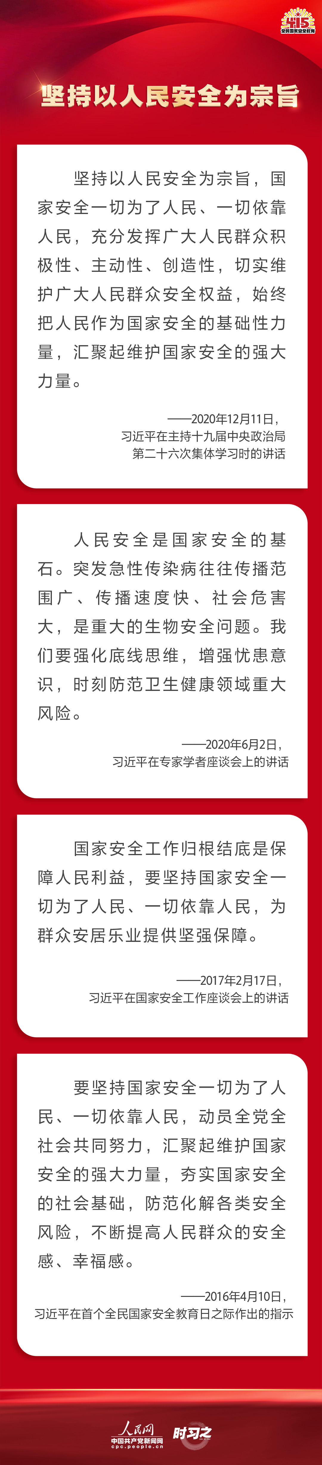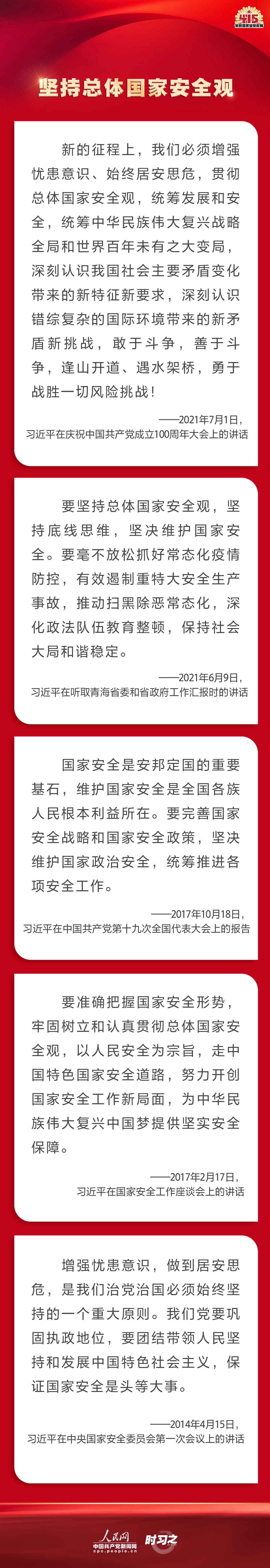 备豫不虞,为国常道。实现中华民族伟大复兴的中国梦,保证人民安居乐业,国家安全是头等大事。2022年4月15日是第七个全民国家安全教育日,让我们一起回顾习近平总书记在不同场合就维护、筑牢国家安全观发表的一系列重要论述,增强维护国家安全的责任感、使命感、紧迫感。