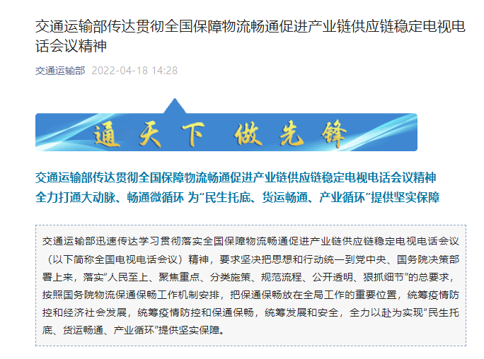 交通运输部迅速传达学习贯彻落实全国保障物流畅通促进产业链供应链稳定电视电话会议(以下简称全国电视电话会议)精神,要求坚决把思想和行动统一到党中央、国务院决策部署上来,落实“人民至上、聚焦重点、分类施策、规范流程、公开透明、狠抓细节”的总要求,按照国务院物流保通保畅工作机制安排,把保通保畅放在全局工作的重要位置,统筹疫情防控和经济社会发展,统筹疫情防控和保通保畅,统筹发展和安全,全力以赴为实现“民生托底、货运畅通、产业循环”提供坚实保障。