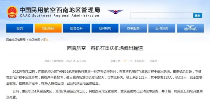 据民航局网站消息,民航局今日就西藏航空一客机在重庆机场偏出跑道发布通报。通报称,2022年5月12日,西藏航空公司TV9833航班在执行重庆—林芝客运任务时,在重庆机场起飞滑跑过程中偏出跑道。根据机组反映,飞机在起飞过程中出现异常,按程序中断起飞,偏出跑道后发动机擦地起火,目前已扑灭。机上共计122人,其中旅客113人,机组9人,已全部安全撤离。在撤离过程中,有36人擦伤扭伤,已及时送当地医院检查。