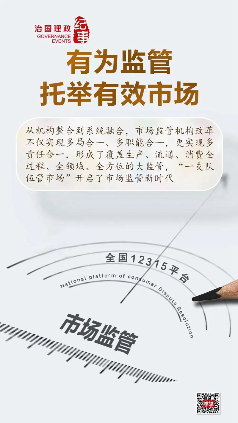 近十年来,市场监管由事后监管转变为事中、事后监管,关口前移提升监管效能;通过调整政府机构成立市场监管总局,形成大市场、大监管格局;逐步理顺市场监管队伍和监管链条,实现“一支队伍管市场”;以有效市场监管促营商环境改善,助力培育高质量的活跃市场主体,近10年中国净增1亿户市场主体;降低市场准入门槛和制度性交易成本,深入开展质量提升行动,营造放心消费环境……市场监管理念、思路、方式的一系列重大变革和生动实践,大幅提升了我国的市场监管效能,支撑着中国经济社会加快迈向高质量发展。