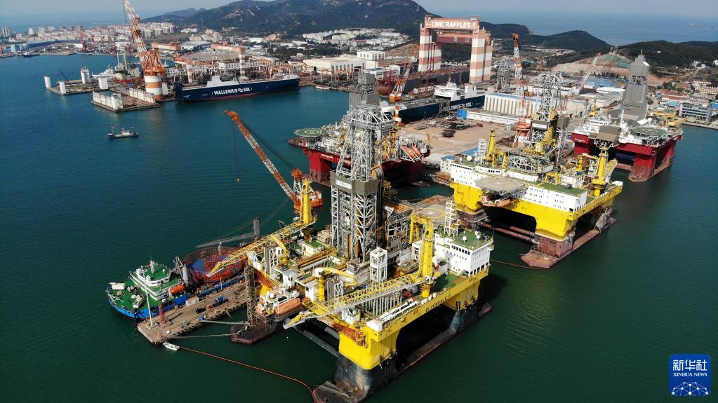 “蓝鲸1号”(前右)及姊妹平台“蓝鲸2号”(前左)在其生产基地中集来福士海洋工程有限公司烟台基地进行维护和保养(2021年10月18日摄,无人机照片)。新华社记者李紫恒摄