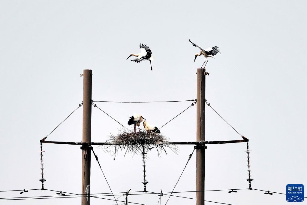 这是山东黄河三角洲国家级自然保护区电线杆上的东方白鹳的巢(2021年5月13日摄)。新华社记者郭绪雷摄