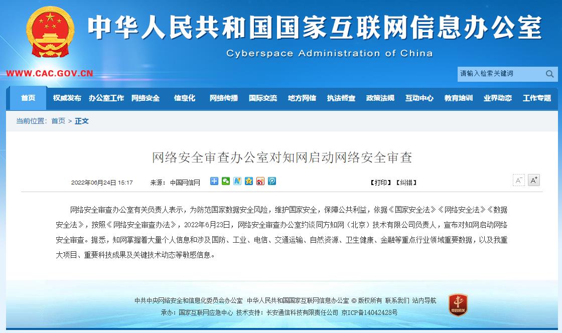网络安全审查办公室有关负责人表示,为防范国家数据安全风险,维护国家安全,保障公共利益,依据《国家安全法》《网络安全法》《数据安全法》,按照《网络安全审查办法》,2022年6月23日,网络安全审查办公室约谈同方知网(北京)技术有限公司负责人,宣布对知网启动网络安全审查。据悉,知网掌握着大量个人信息和涉及国防、工业、电信、交通运输、自然资源、卫生健康、金融等重点行业领域重要数据,以及我重大项目、重要科技成果及关键技术动态等敏感信息。