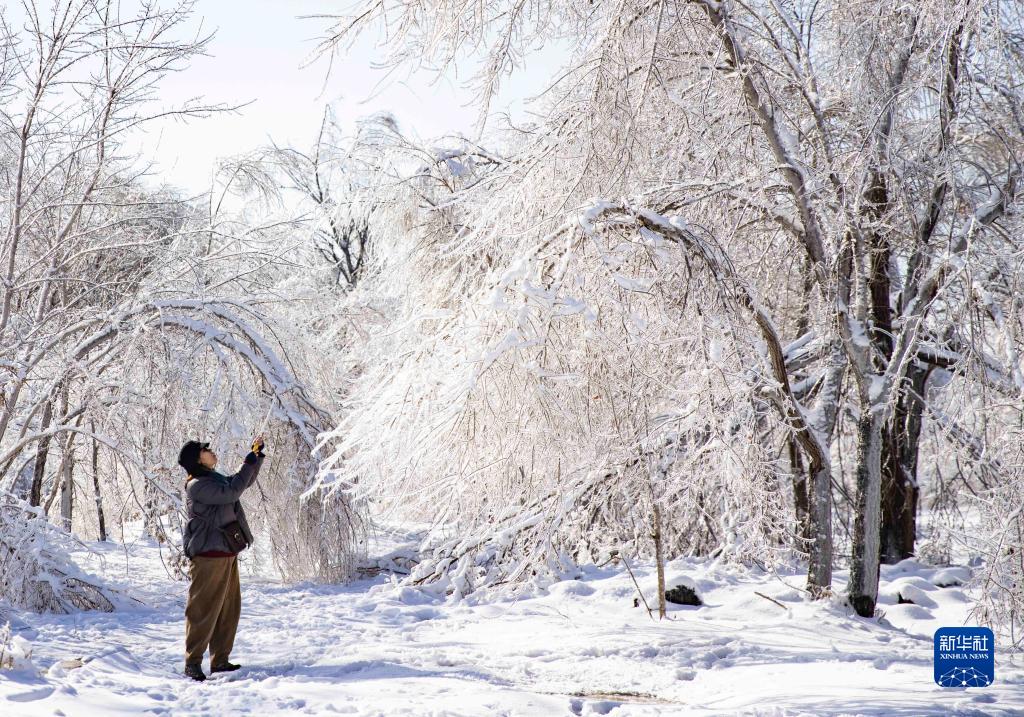 11月12日,在哈尔滨市太阳大道附近,一市民在结满冰晶的树前拍照。