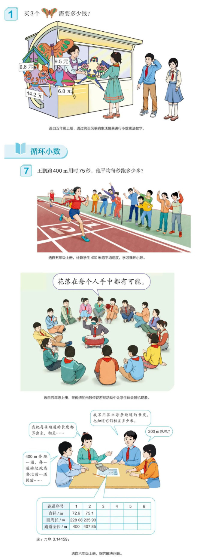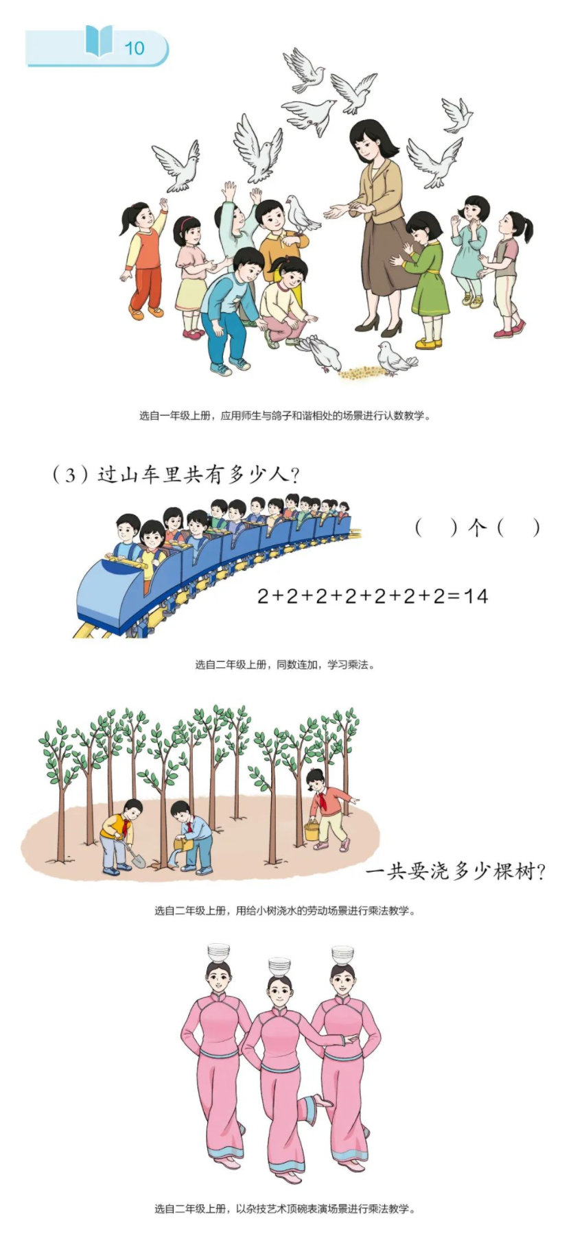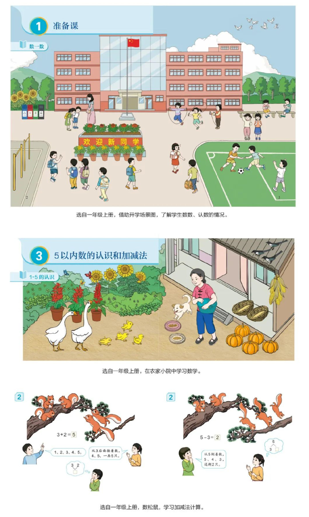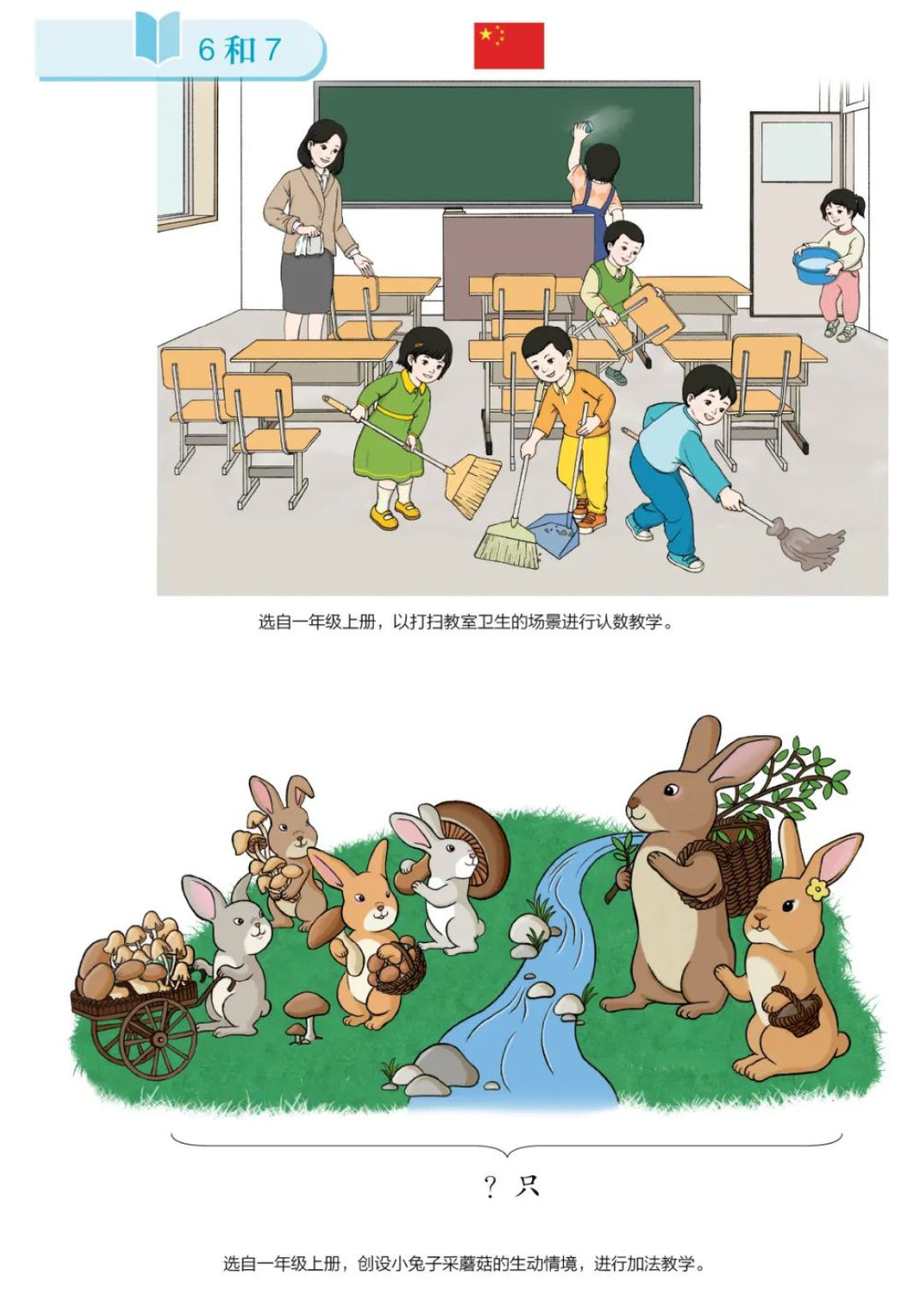 新绘制的小学数学教材插图在整体上力求体现出“中国风”“时代感”“精气神”和“数学味”的风格特点,展现新时代中国少年儿童阳光、向上、愉悦的精神面貌,坚持大众主流审美取向,遵循儿童认知与身心发展规律,清新雅正,简洁大方,图文相融。(人民教育出版社)