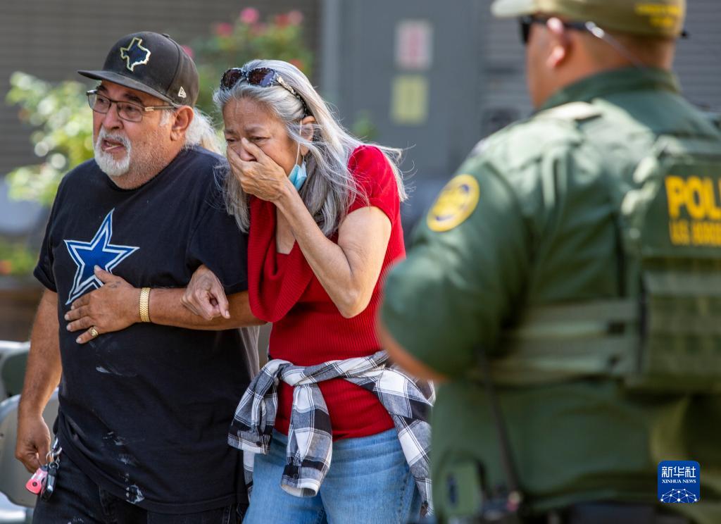 5月24日,在美国得克萨斯州南部尤瓦尔迪市,枪击事件发生后人们惊魂未定。新华社/美联