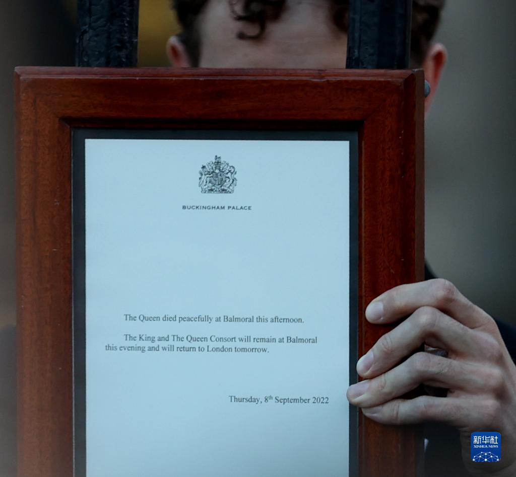 9月8日,在英国伦敦,工作人员将英国女王伊丽莎白二世去世的告示安放在白金汉宫大门上。新华社记者李颖摄